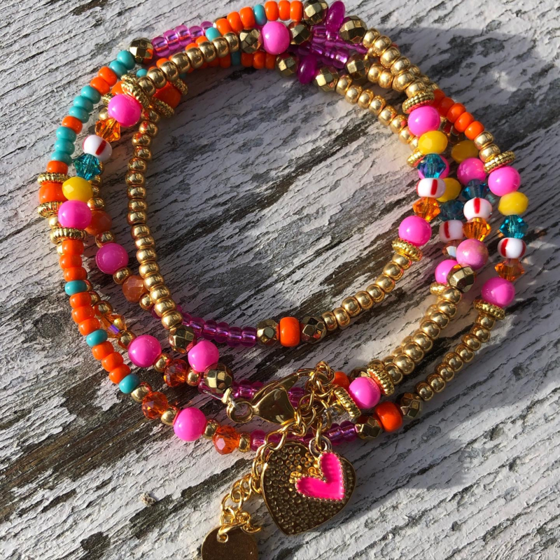 Deze mooie set bestaat uit 6 armbanden. Deze armbanden zijn gemaakt met onze ronde RvS goldcoloured kralen icm de vrolijk gekleurde glaskralen 4 mm icm mat fel en pastel…€ 19,95
